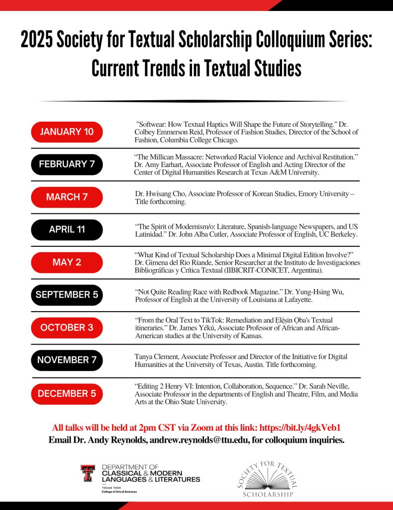 February 7. “The Millican Massacre: Networked Racial Violence and Archival Restitution.” Dr. Amy Earhart, Associate Professor of English and Acting Director of the Center of Digital Humanities Research at Texas A&M University. Video.